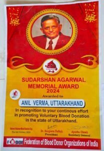 विदित हो कि सन् 1971 भारत – पाक युद्ध के दौरान अनिल वर्मा ने घायल सैनिकों के लिए एनसीसी कैडेट के रूप में 18 वर्ष 02 महीने की उम्र में पहली बार रक्तदान करने के बाद से ही रेगुलर ब्लड डोनर रहे हैं। उन्हें इससे पूर्व भी अनेक प्राईड ऑफ इण्डिया अवाॅर्ड , भारत रत्न पंडित गोबिंद बल्लभ पंत रक्तदाता शिरोमणि अवाॅर्ड, रक्त रत्न अवार्ड , रक्तदाता