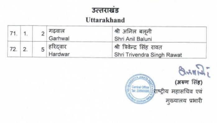 उत्तराखंड के राजनीति से आज की बड़ी खबर है। भाजपा की दूसरी सूची में उत्तराखंड की दो सीटों पर भाजपा ने प्रत्याशी के घोषित। लोकसभा चुनाव के लिए बीजेपी ने उम्मीदवारों की दूसरी लिस्ट जारी कर दी है। इसमें उत्तराखंड की बची हुई दोनों सीटों के प्रत्याशी भी घोषित कर दिए हैं।हरिद्वार से त्रिवेंद्र रावत को टिकट मिला है जबकि पौड़ी से पार्टी के राष्ट्रीय मीडिया प्रमुख अनिल बलूनी बीजेपी के उम्मीदवार होंगे।